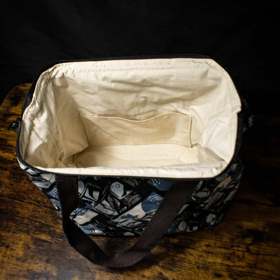 With a spacious interior, it’s ideal for carrying everything from your knitting supplies to everyday essentials. The wire frame design ensures your bag holds its shape, while the vibrant fabric adds a fun flair to any outfit. Whether you’re heading to a convention, a craft fair, or just out and about, the "Battle Bizarre" bag will make a statement wherever you go!
